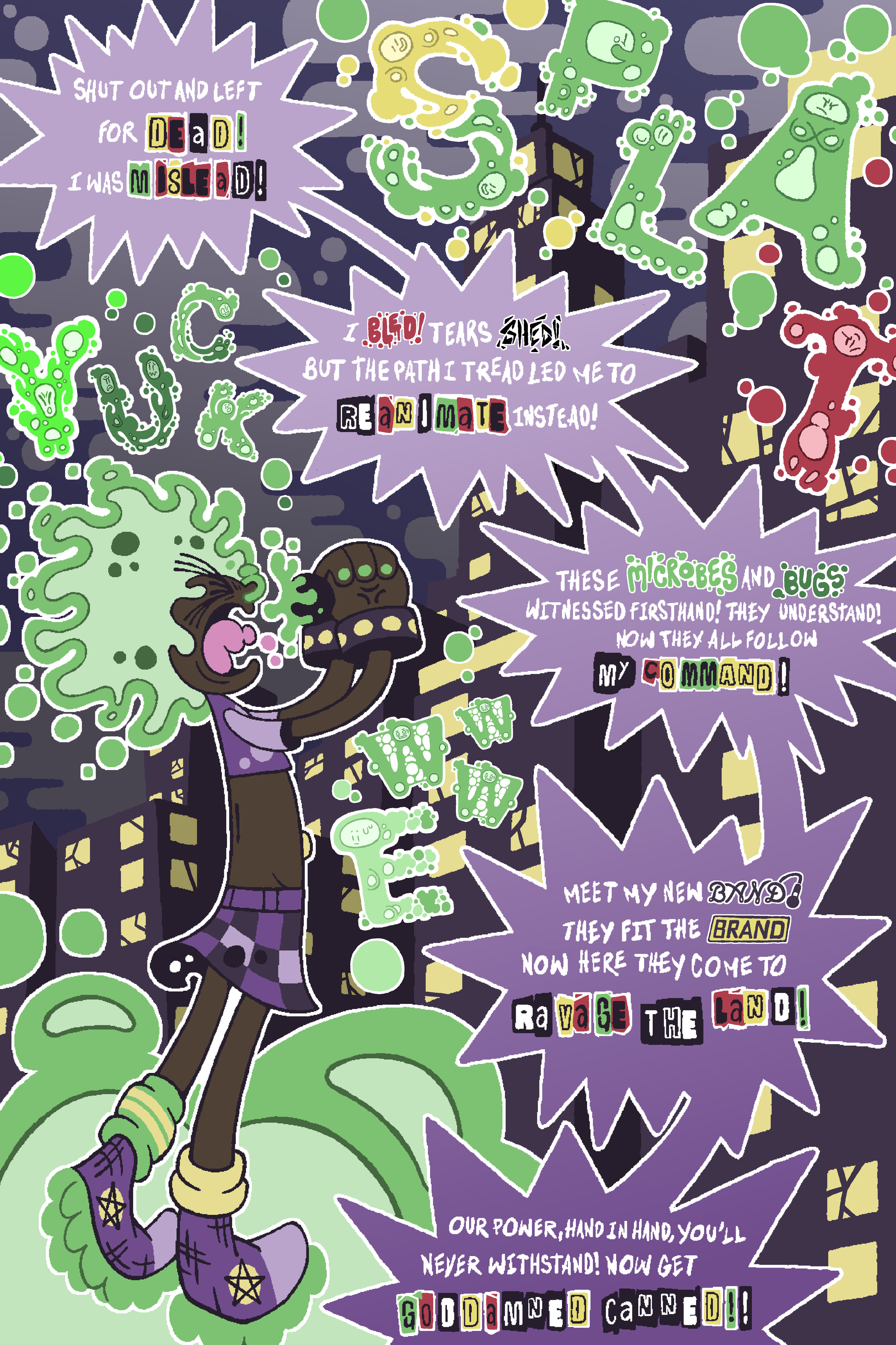 RAGEOUS REMEDY: REMIXED is a recreation of a short comic page I created suring my sophomore year at MIAD. This full page illustration depicts Rageous Contagious, a reincarnated rock star commanding her army of germ monsters with her music.