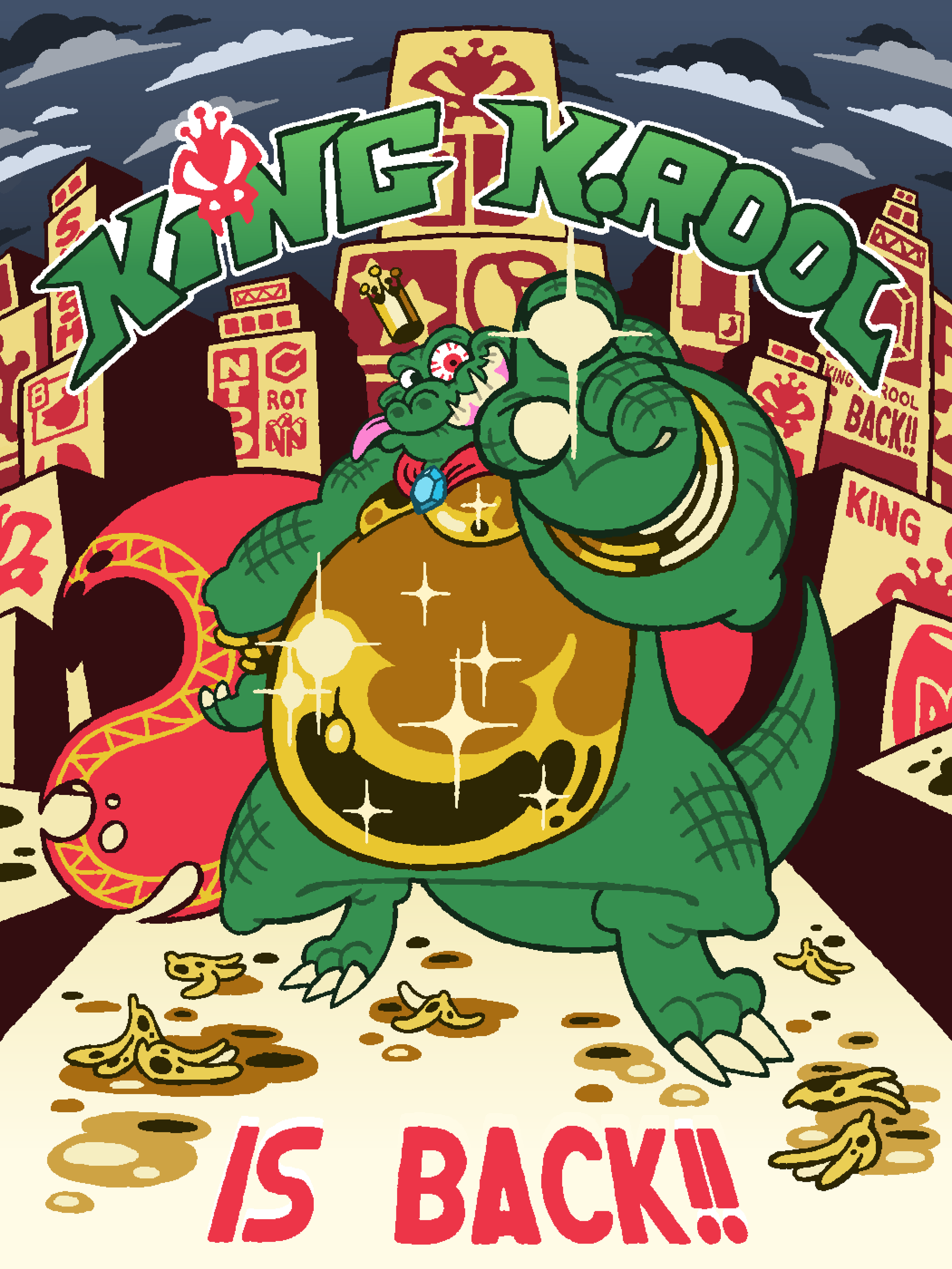 KING K. ROOL IS BACK!! is an illustrated piece dedicated to the triumphant return of the king of rot, King K. Rool, to the Donkey Kong franchise. After 18 years since his last appearance in Donkey Kong, and 7 years since his latest appearance in Super Smash Bros. Ultimate, King K. Rool is back with a bang in Donkey Kong Bananza, using the power of the Banandium Root to take the city of New Donk by storm.