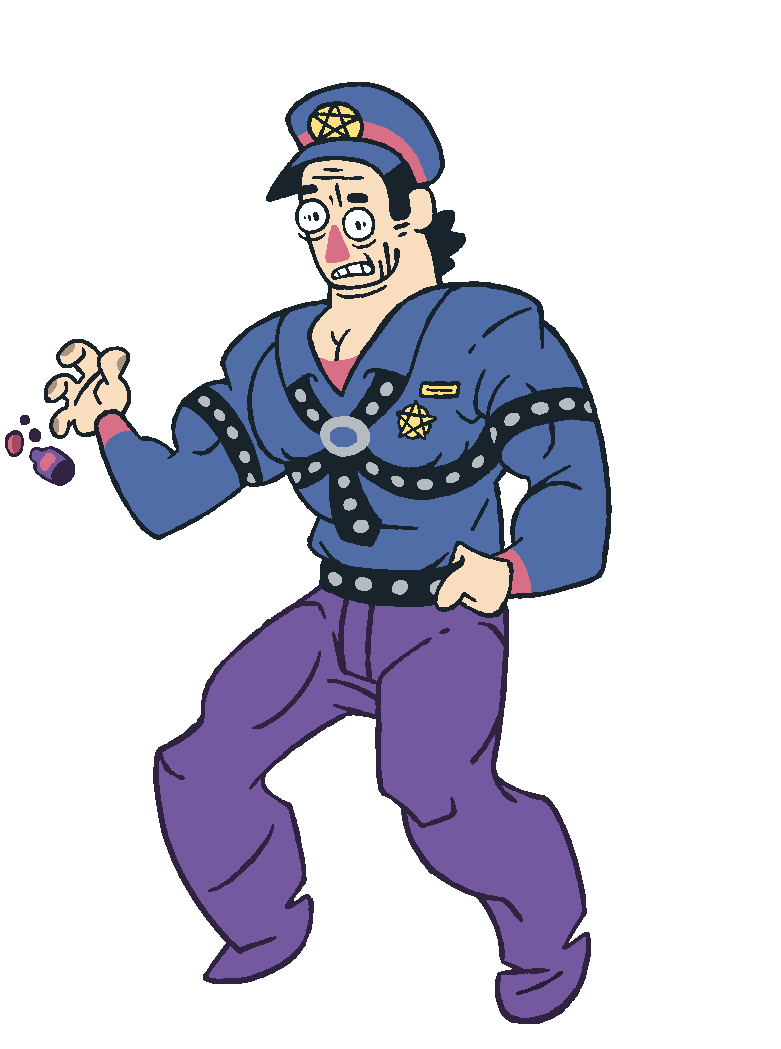 The big, burly, and bumbling officer, and lead detective on the case, with a not so subtle leather getup.