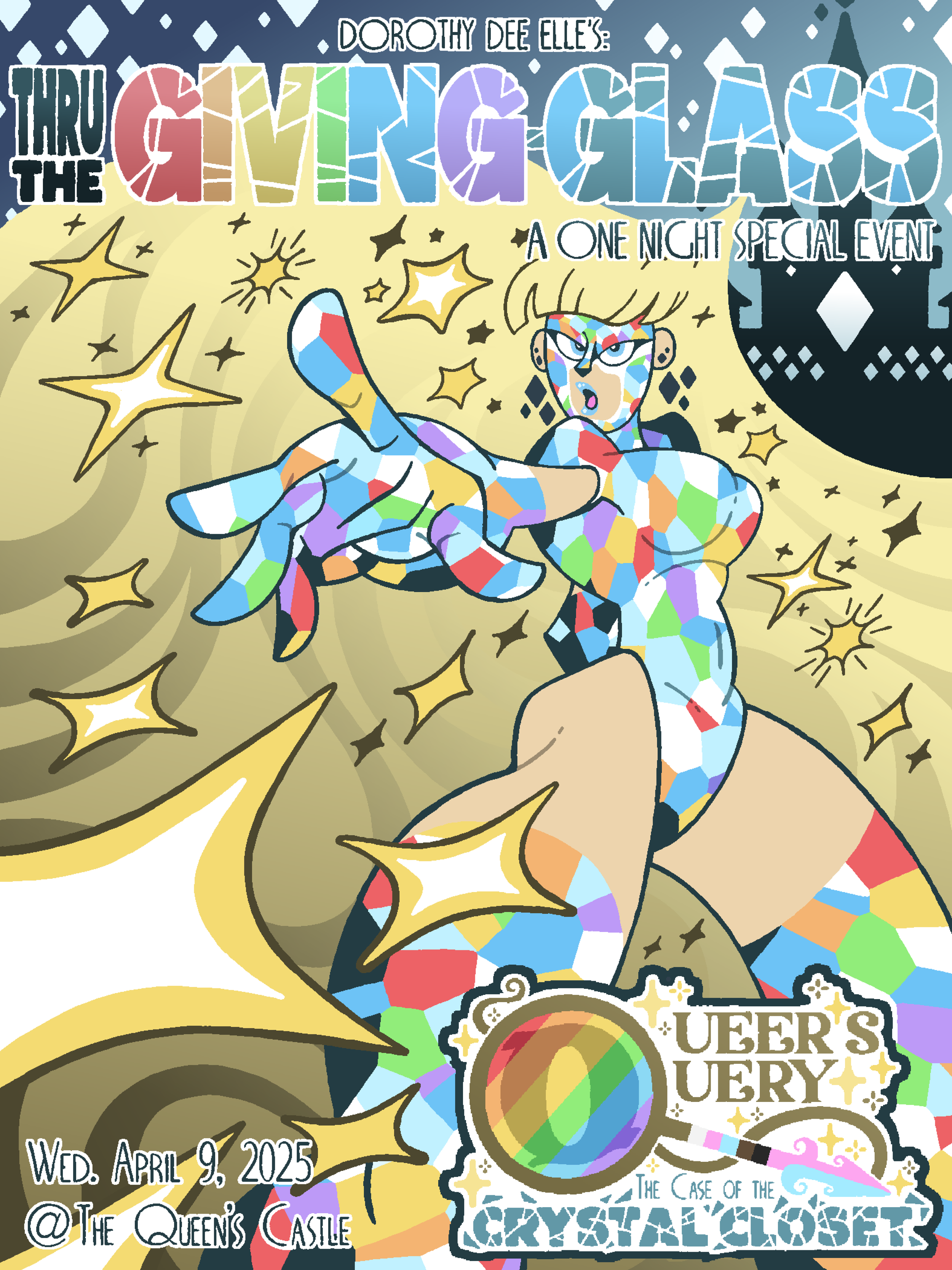 THRU THE GIVING-GLASS is a mock drag show flyer illustration created as a teaser and prelude to what would become my senior thesis at MIAD, “Queer’s Query: The Case of the Crystal Closet. The poster depicts Dorothy Dee Elle, a stained glass themed drag queen, promising a special event like no other, hosted at her very own bar, The Queen’s Castle.