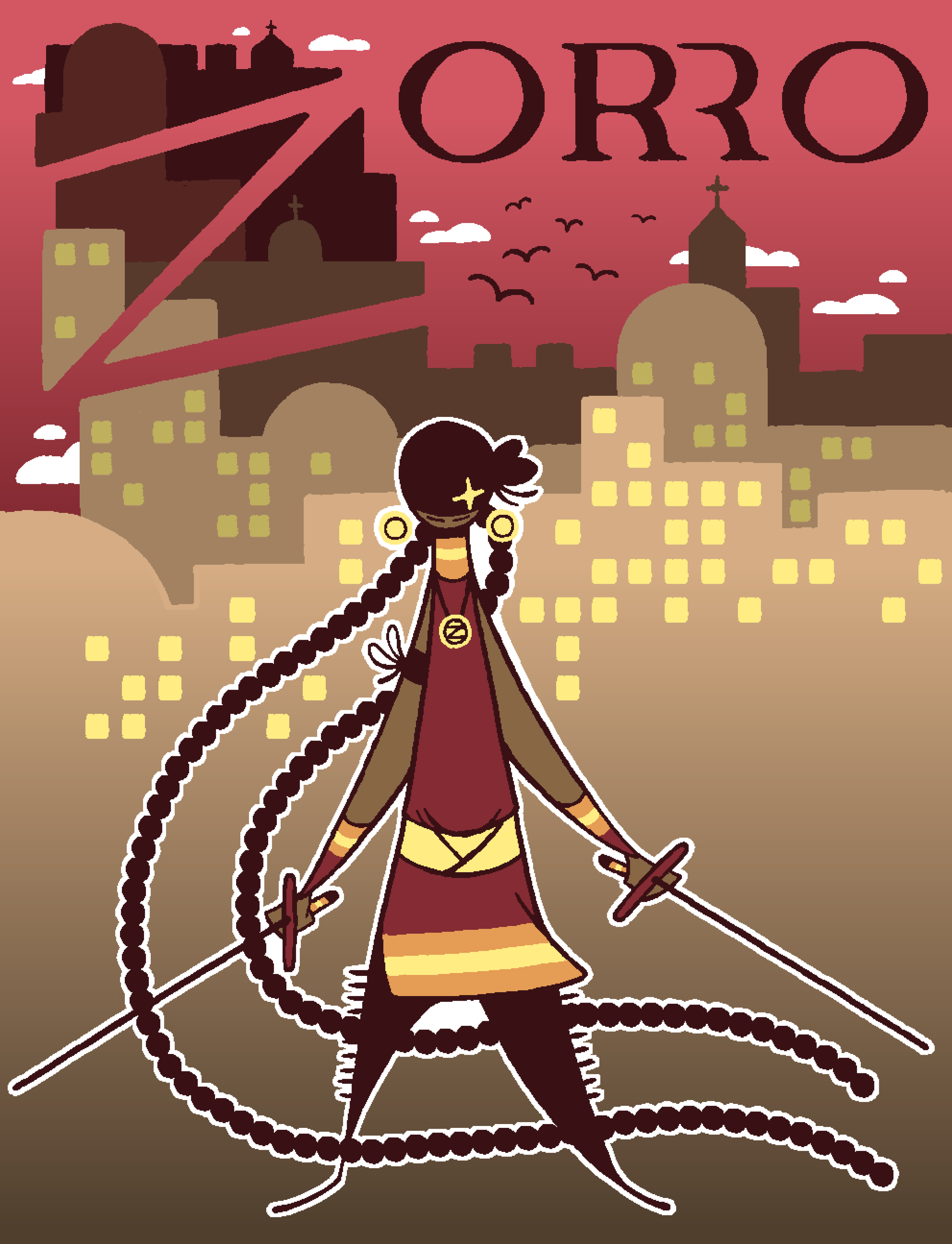 ZORRO is an illustrated cover page for a hypothetical book series, taking my own spin on the character of Zorro, meant to dive deeper into his indeginous roots.
